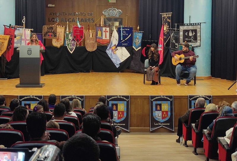El espíritu berberisco se enaltecióp ayer, domingo, con el pregón de Nazaret Navarro. La presentadora de televisión combinó su proclama festera con la glosa recitada de su hermana, acompañada de los sones de una guitarra. El salón del Ayuntamiento de Los Alcázares se cubrió de banderas y pendones de las peñas berberiscas y cristianas. Solo falta que corra el calendario hasta el 14 de abril.
