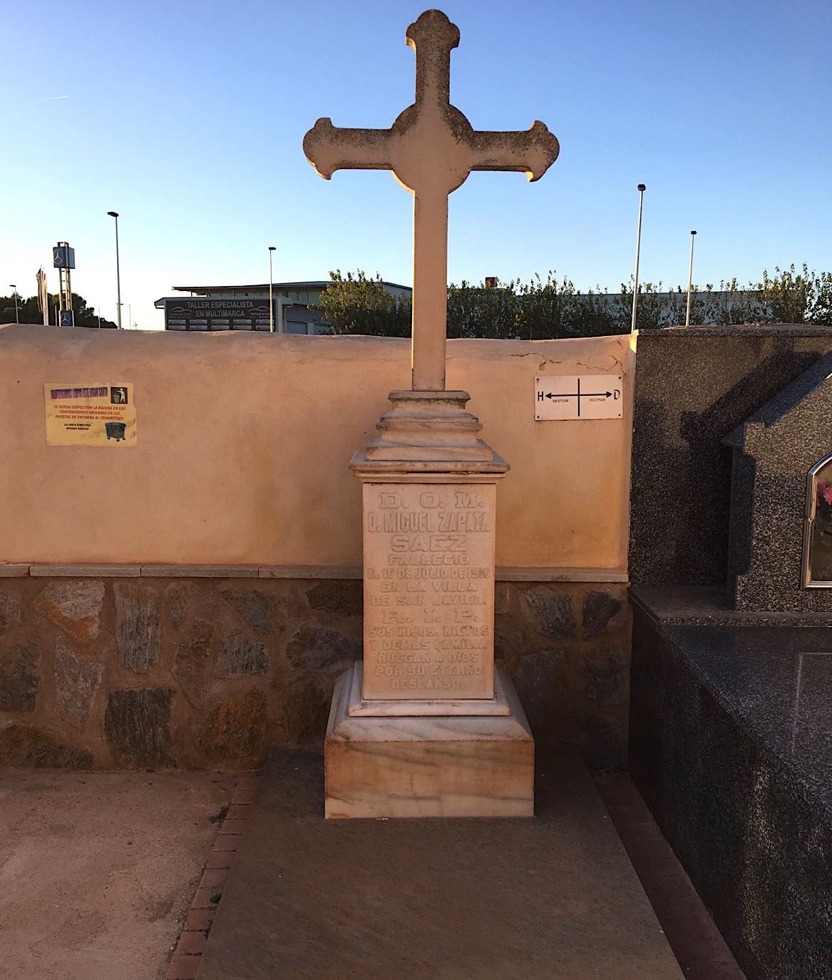 En 1900 se construye el camposanto de San Javier, donde fueron creándose panteones y mausoleos, algunos de estilo neomudéjar. Según relata el historiador y edil, hubo en tiempos un espacio en la zona noroeste para enterrar a los ahorcados, que entonces no se les daba sepultura en tierra consagrada. En la zona norte se instaló la fosa común de la Guerra Civil. El monolito de los caídos de la Falange que se erguía en la plazoleta trasera de la iglesia, se trasladó también al cementerio con la remodelación del centro urbano.