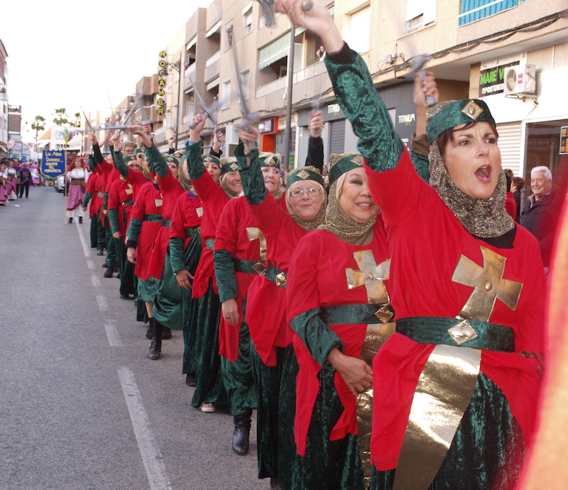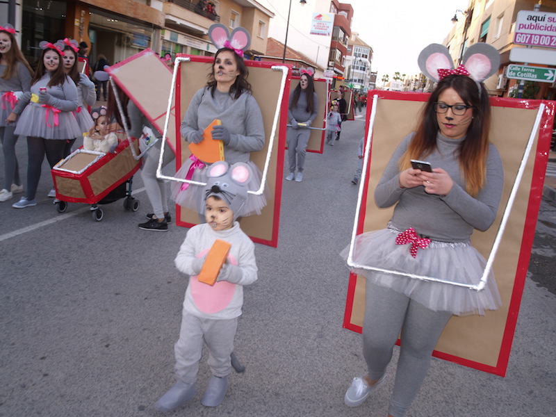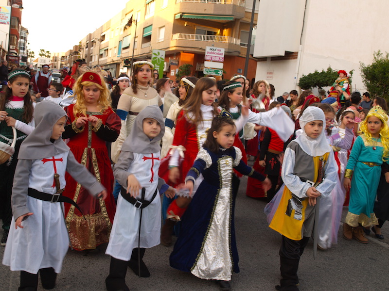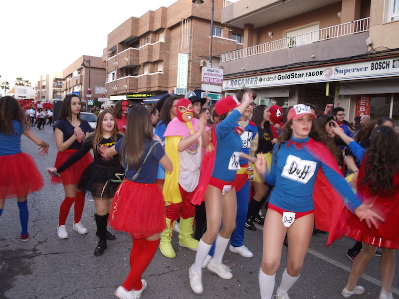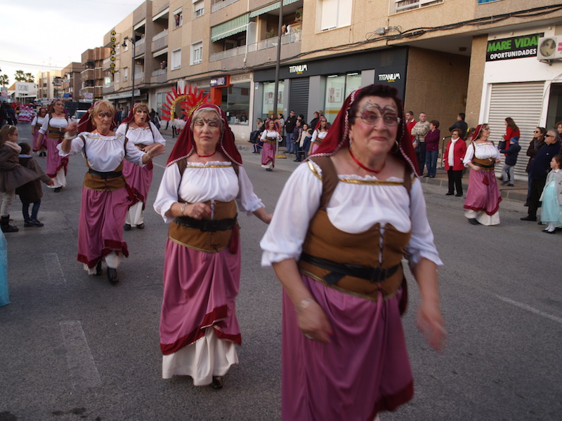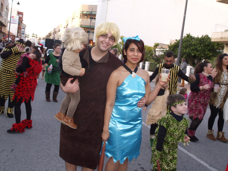 La comparsa El Palmeral puso un toque de humor con las innumerables familias Picapiedra, en una pandilla de Bettys y pequeños trogloditas. Les segúian la peña de la Federación de asociaciones de padres y madres de alumnos, que eligió la ambientación medieval para sacar a la calle a todos los escolares. También la peña de los mayores Los Años Dorados eligió trajes históricos llenos de fantasía.